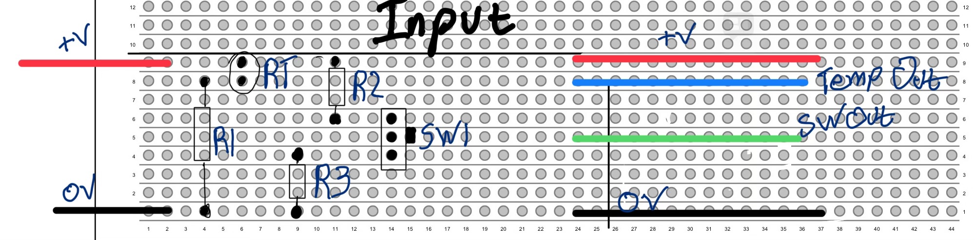Colour coding: Blue = TempOut Green = SwitchOut Red = +V, Black = 0V