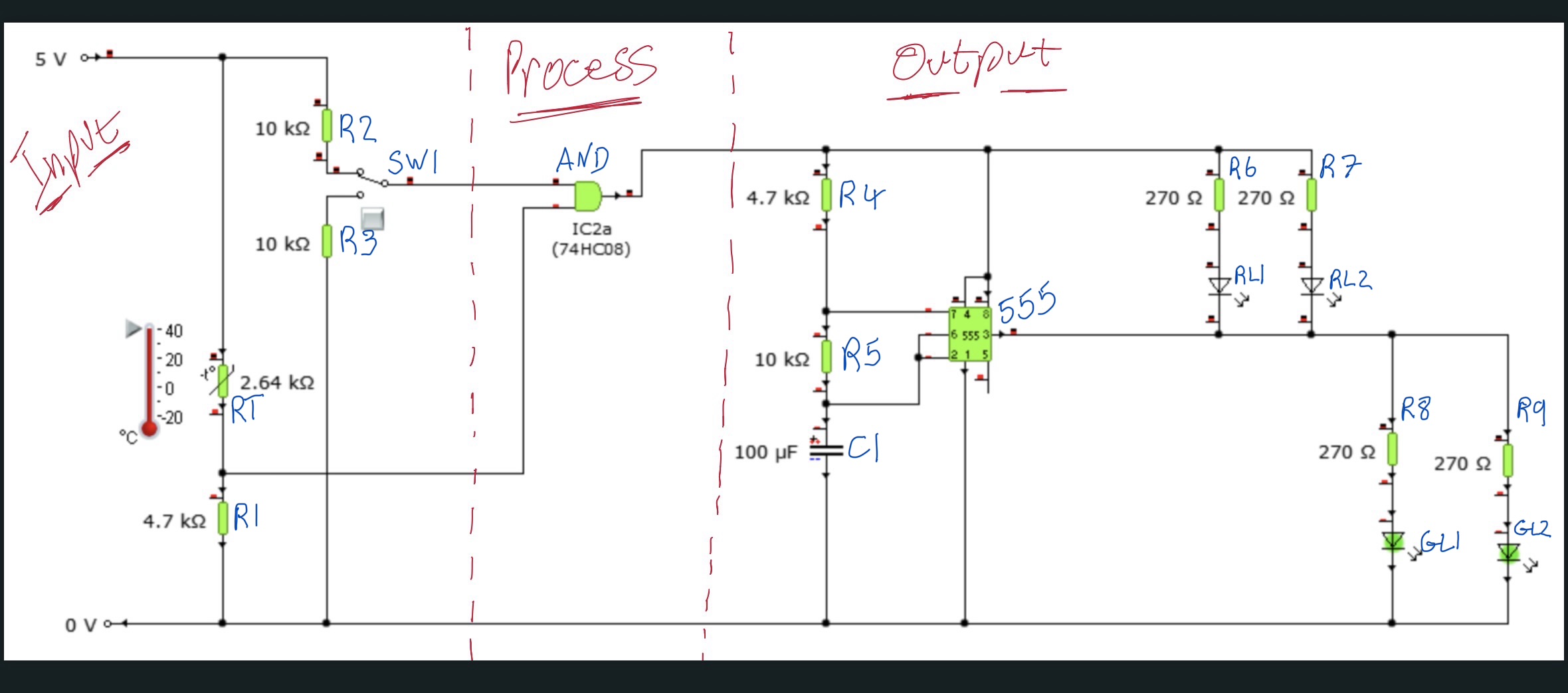 Uses a 74HC08 AND gate โ only outputs HIGH when TempOut AND SwitchOut are HIGH.